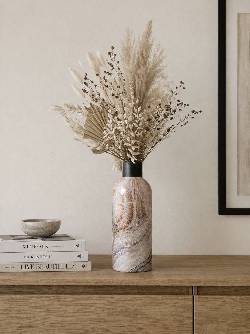 Stylová kovová váza s originálním mramorovým dekorem zaujme na první pohled svým elegantním provedením. Jemné přírodní tóny v kombinaci s černým hrdlem dodávají váze moderní a zároveň nadčasový vzhled. Skvěle se hodí pro aranžování sušených květin, travin nebo jako samostatná designová dekorace na komodu, stůl či polici. Ideální doplněk pro interiér v přírodním, minimalistickém i boho stylu.