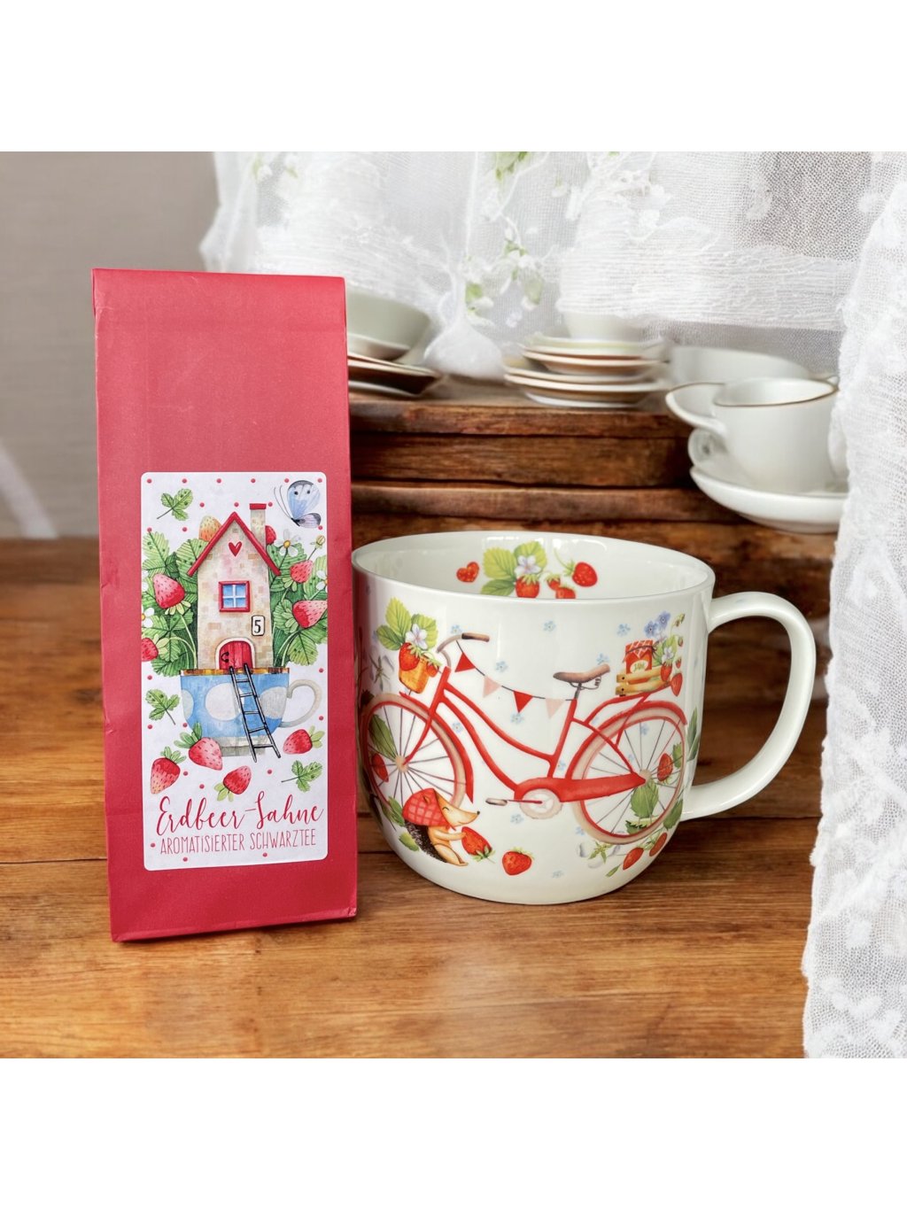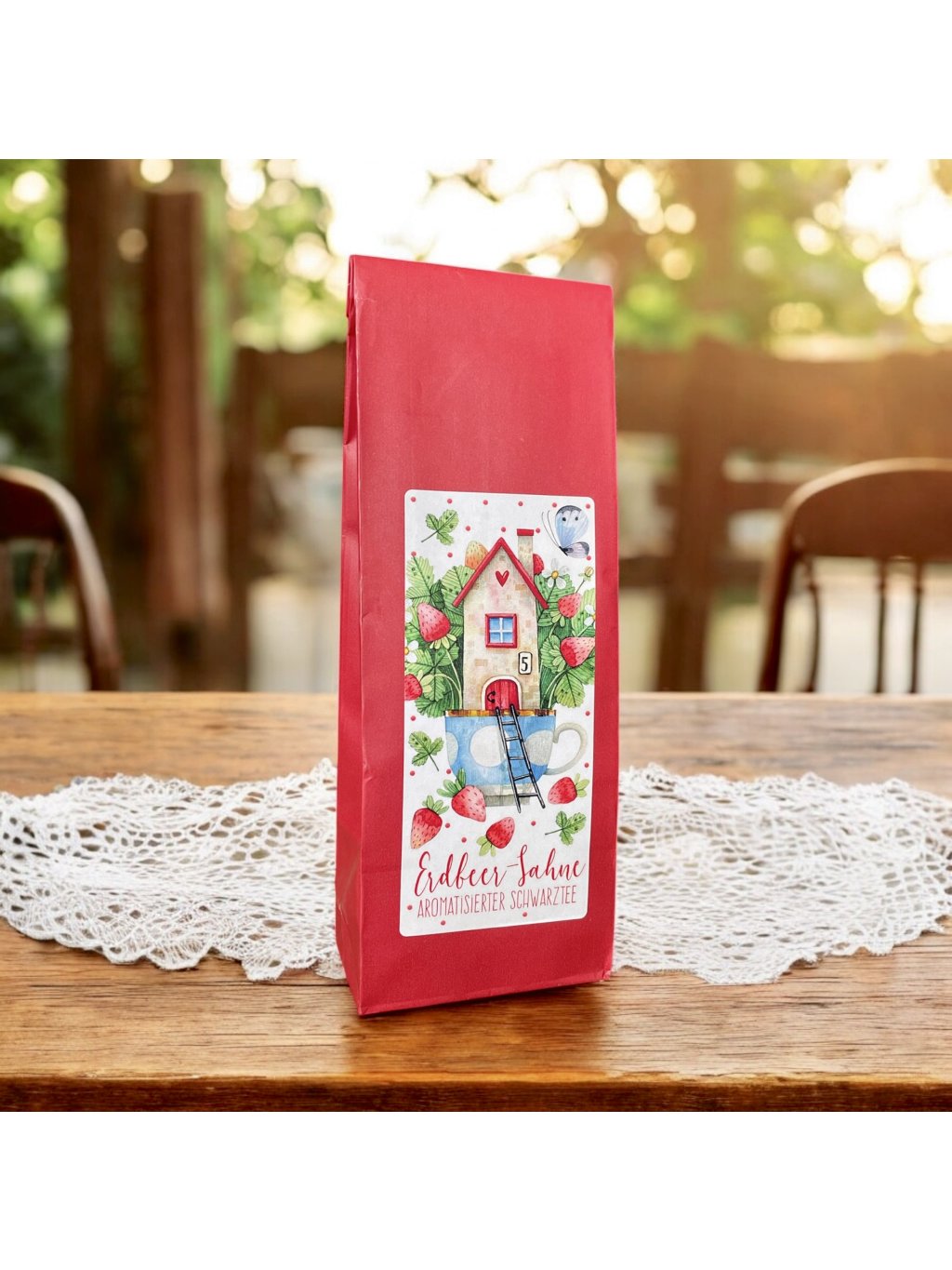 Matný červený povrch čajového sáčku mu dodává sofistikovaný nádech, zatímco etiketa vás přenese do světa šťavnatých jahod, svěžích jahodníků, domácí jahodové marmelády a idylického statku.