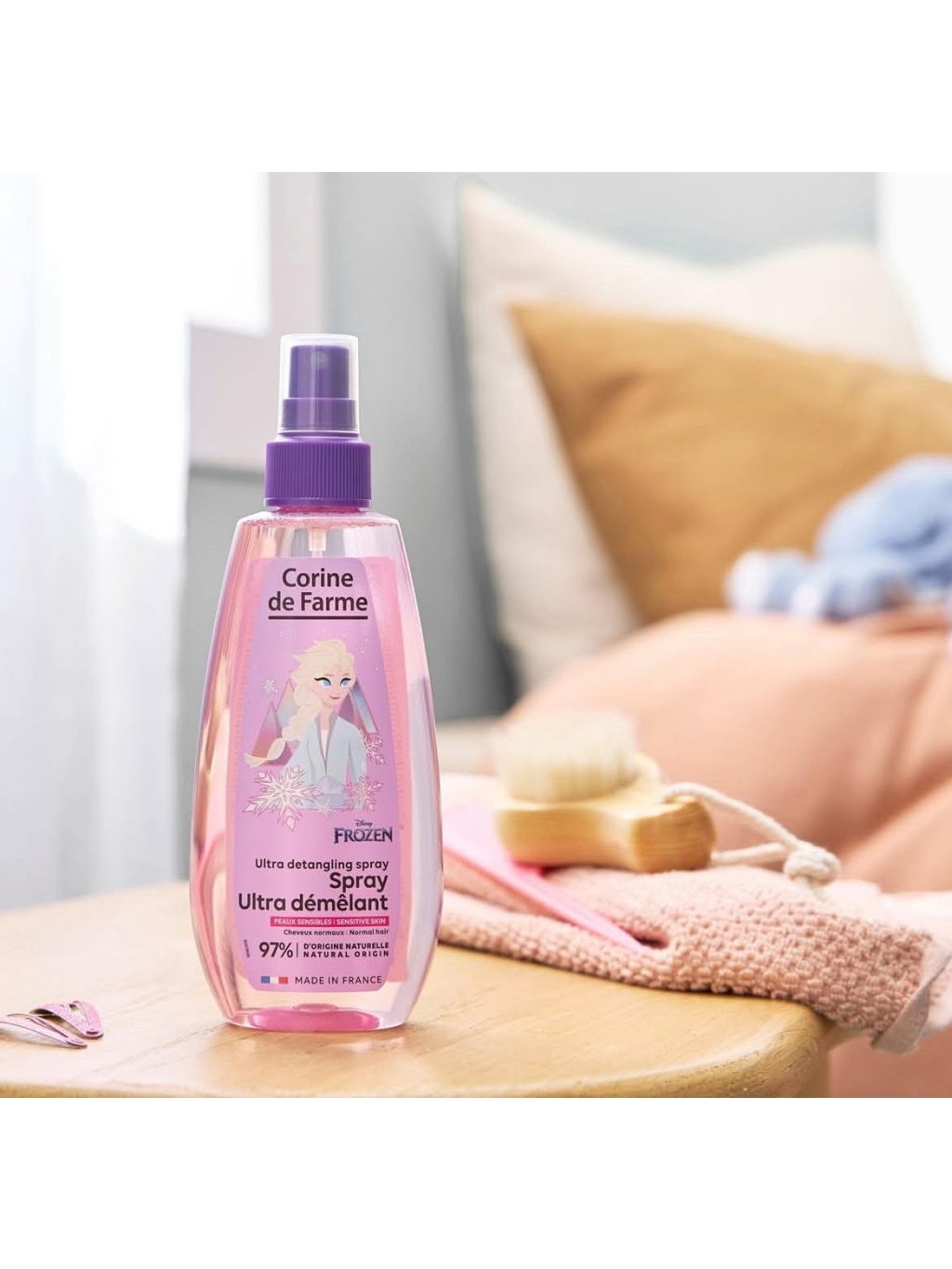 Corine de Farme Frozen II Sprej na rozčesávání vlasů je ideálním pomocníkem pro snadné a šetrné rozčesávání vlasů vašich dětí. Složení obsahuje až 97 % přírodních ingrediencí, které jemně pečují o vlasy i vlasovou pokožku, aniž by je zatěžovaly. Tento přípravek je speciálně navržen pro děti od 3 let a je vhodný pro normální vlasy i citlivou pokožku.