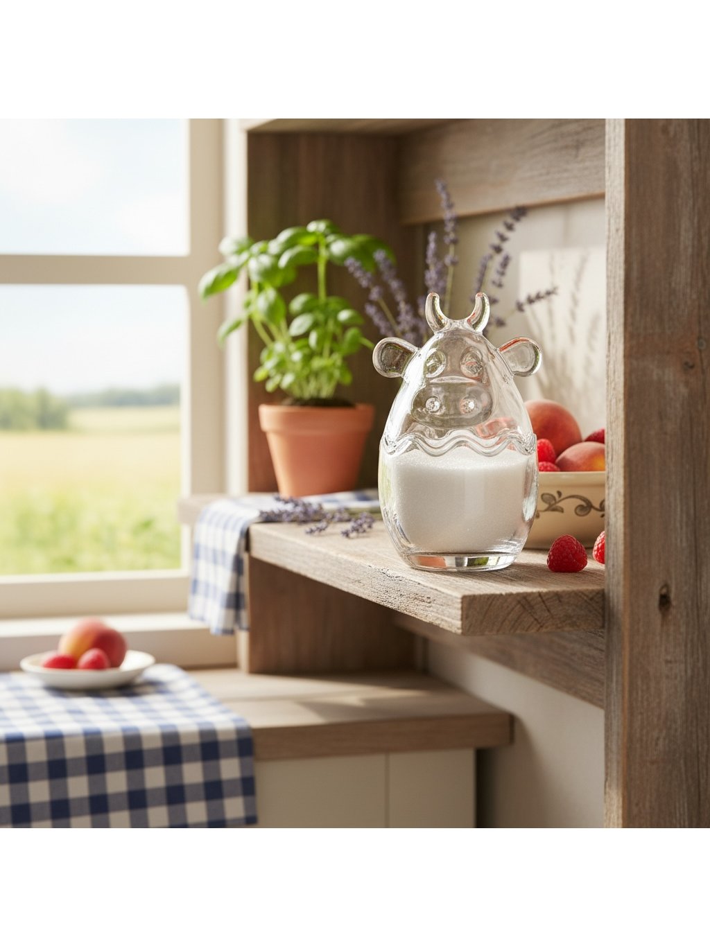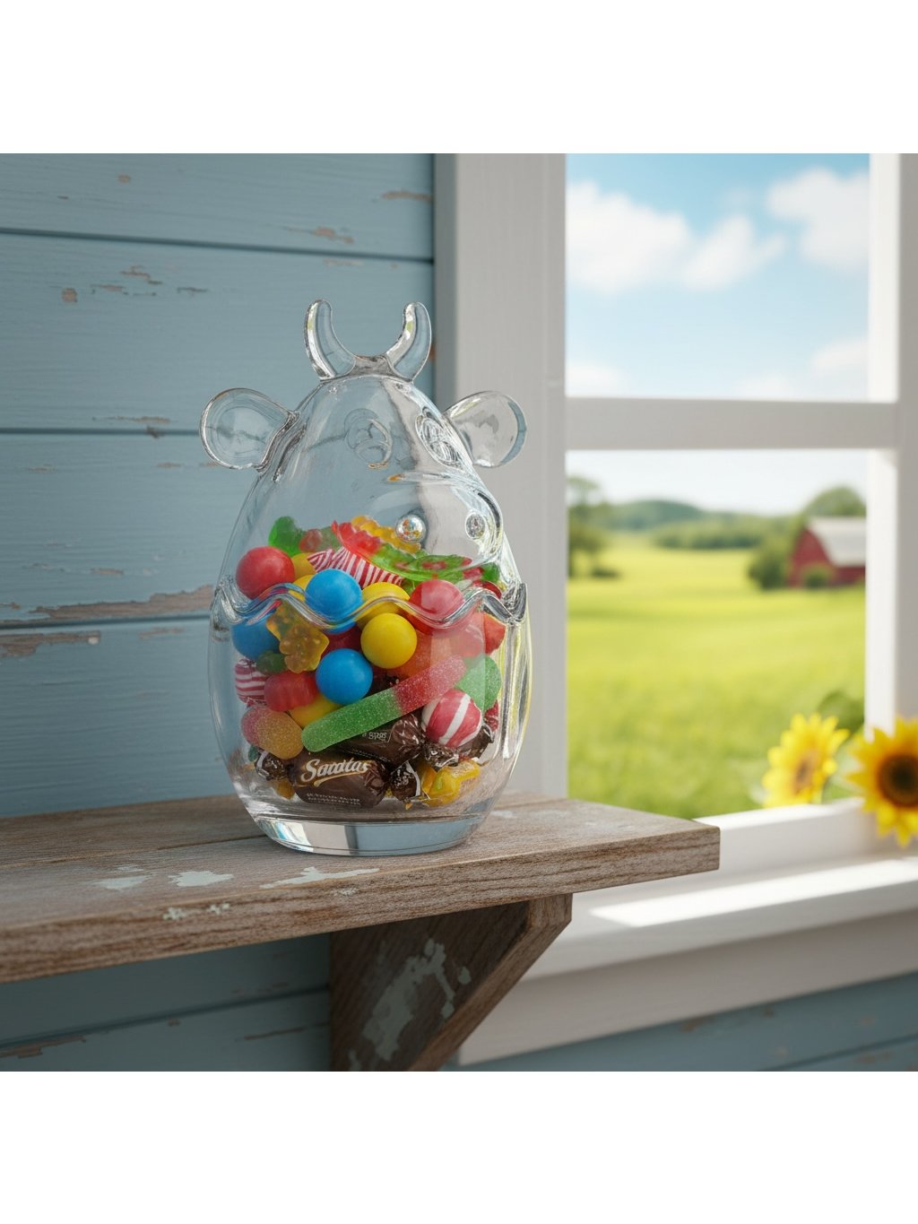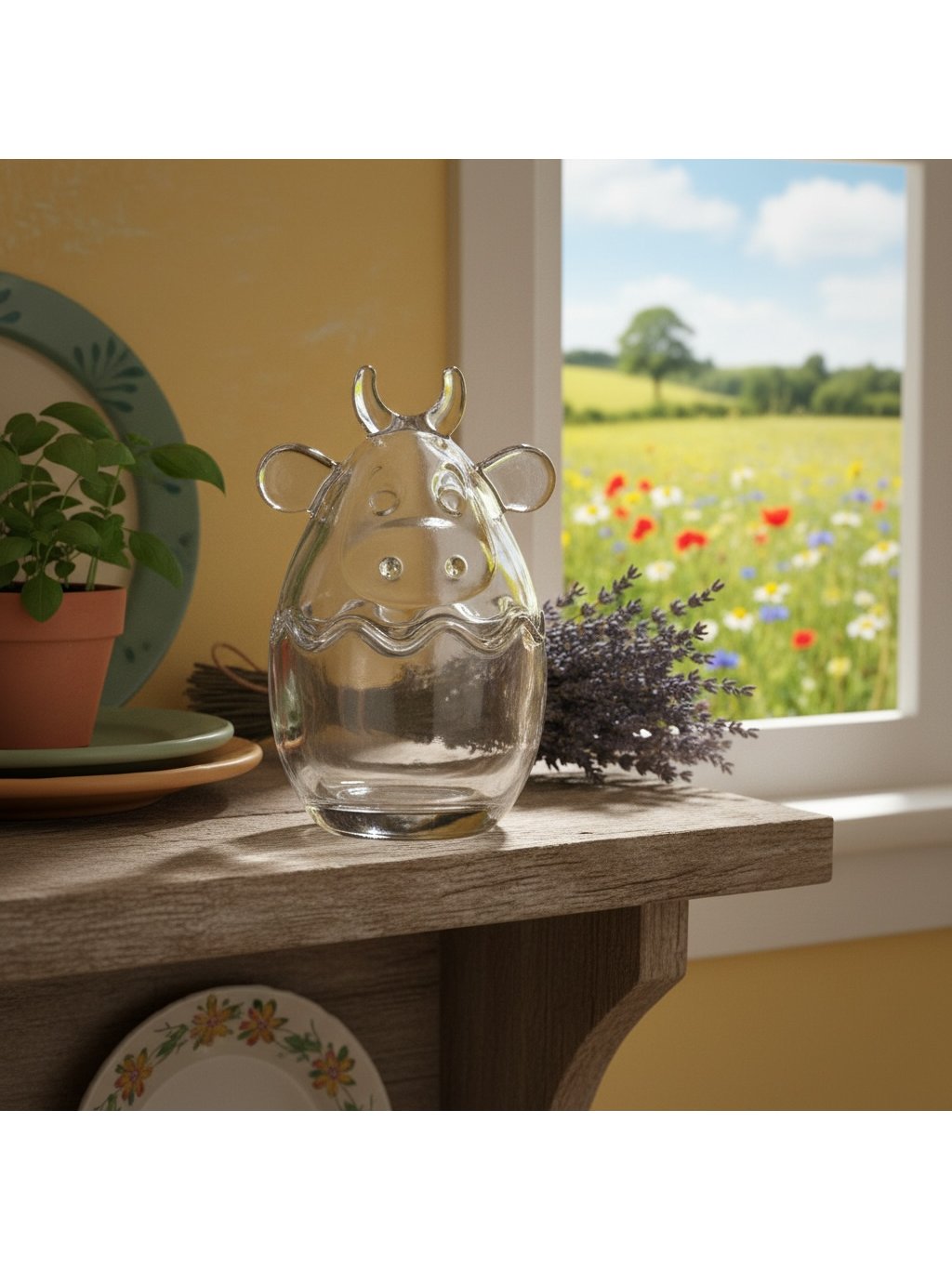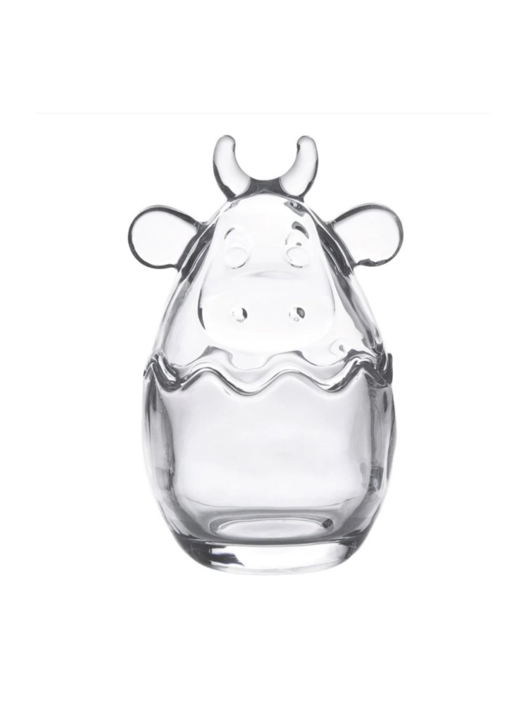 Pěkná skleněná dózička s poklopem ve tvaru kravské hlavy. Dózička je vhodná na skladování cukrovinek, bonbonů nebo velikonočního vajíčka.