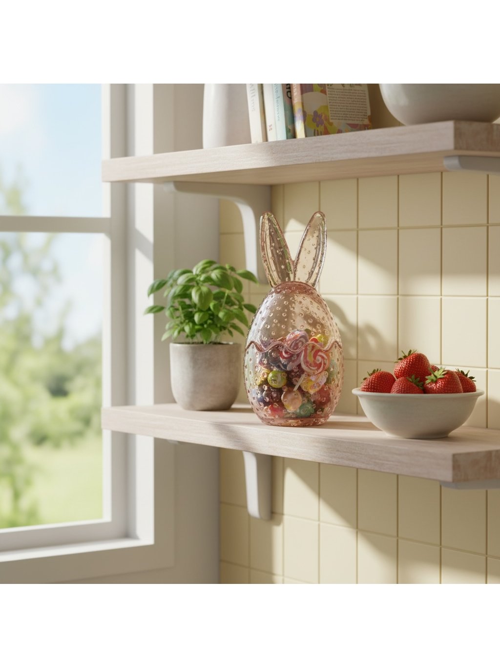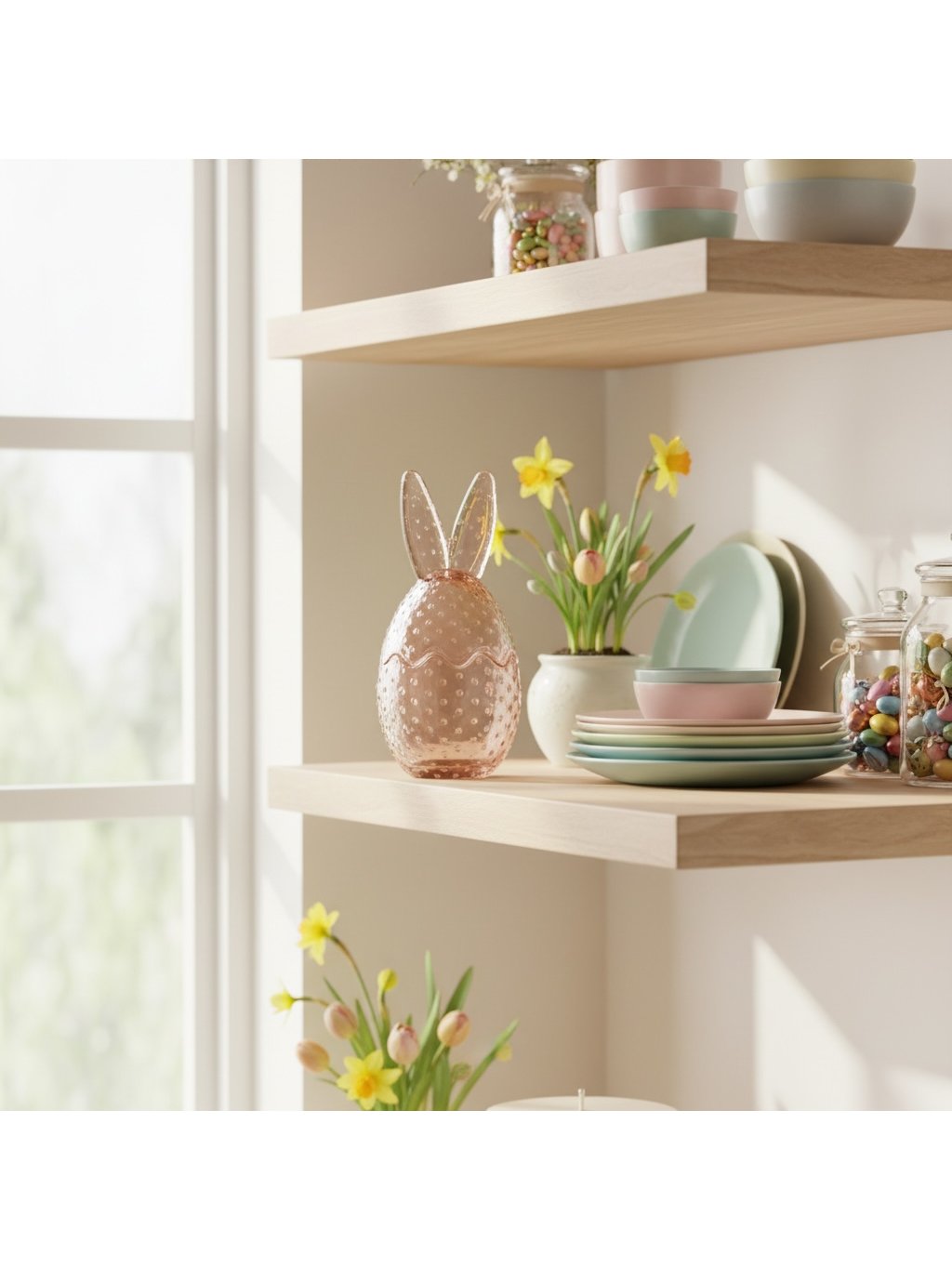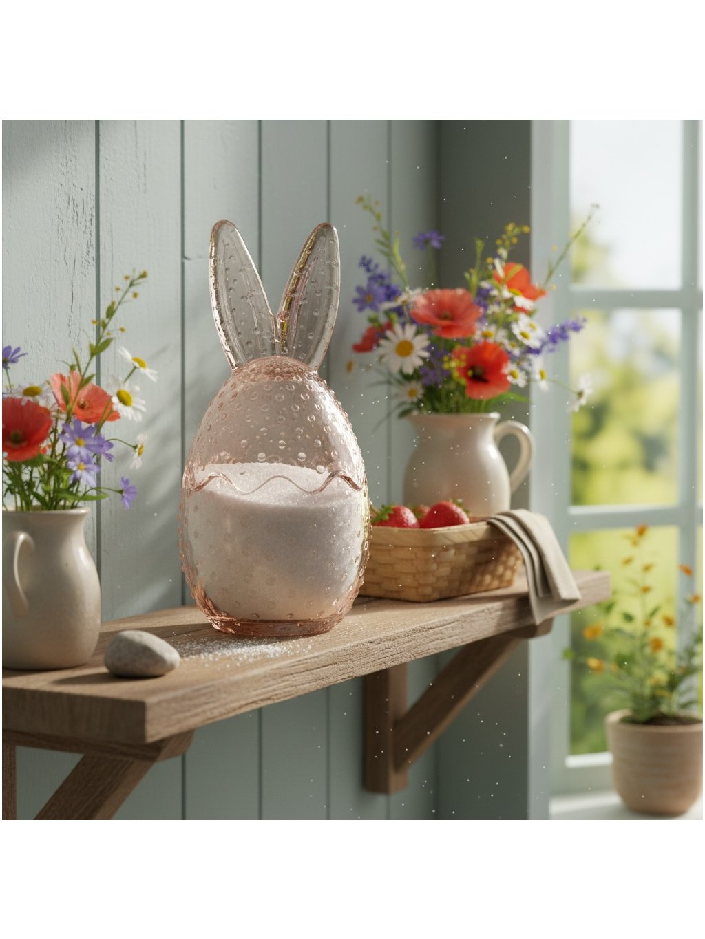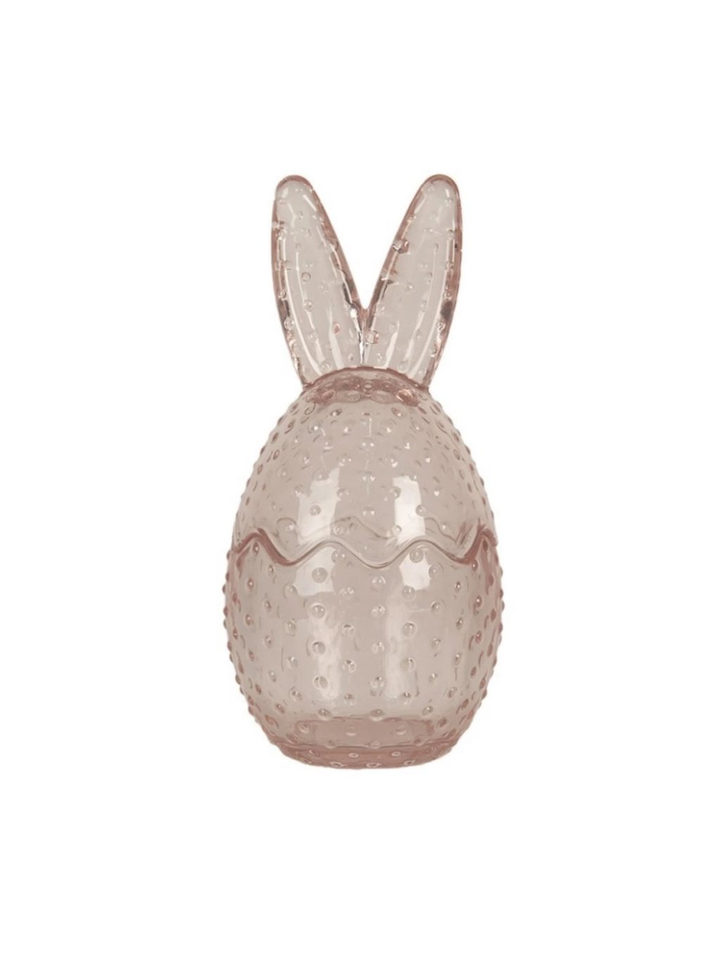 Krásná růžová romantická skleněná dóza, nádoba na cukrovinky s víčkem s králičíma ušima nahoře. Velmi pěkná také k prezentaci velikonočních vajíček.