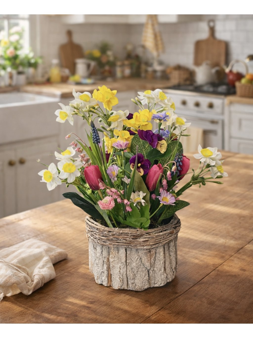 Květiny jsou umístěny v originálním rustikálním obalu s imitací kůry, který perfektně zapadne do venkovského, vintage i přírodního stylu bydlení. Dekorace se krásně vyjímá na kuchyňském stole, komodě, parapetu nebo v jídelně a navodí pocit jara po celý rok – bez nutnosti jakékoli péče.