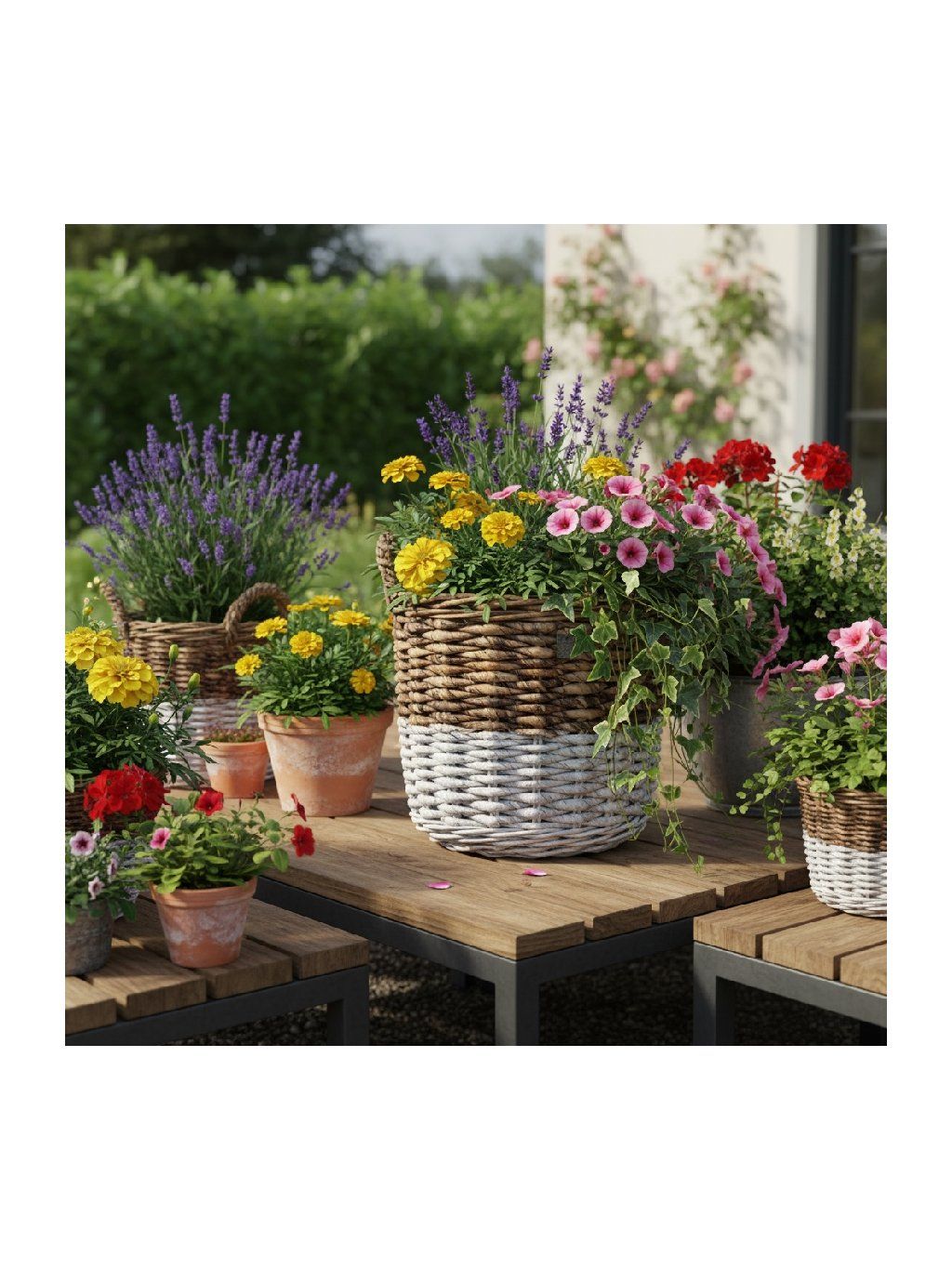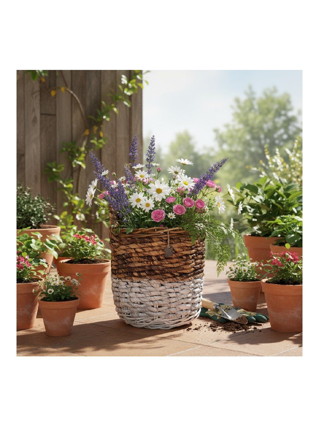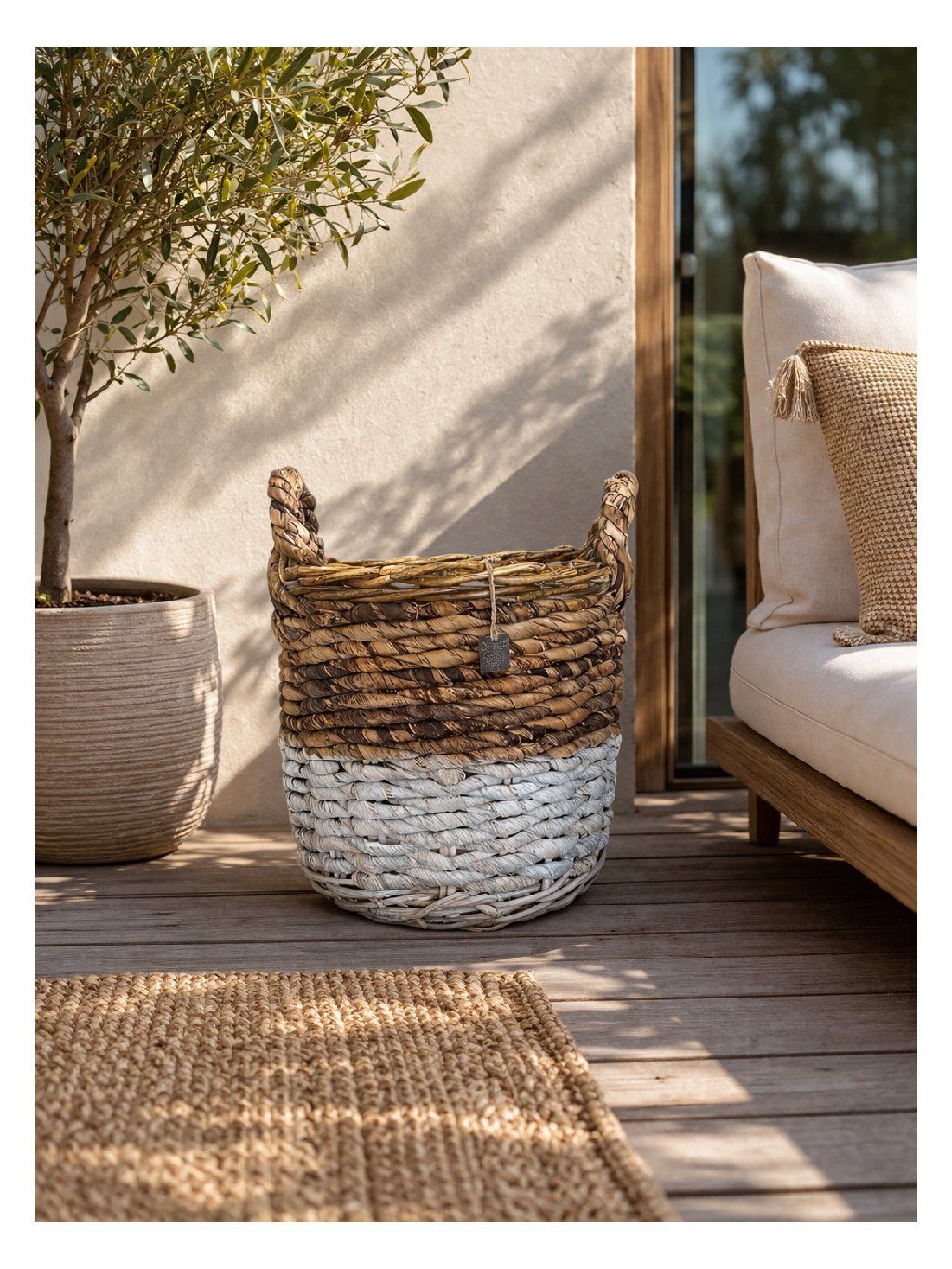 Koš je vybaven praktickými uchy, která usnadňují přenášení, a nabízí široké využití – jako obal na květináč, úložný prostor na deky, polštáře nebo drobnosti na terasu. Díky svému designu se stane nejen praktickým pomocníkem, ale i výrazným dekorativním prvkem.