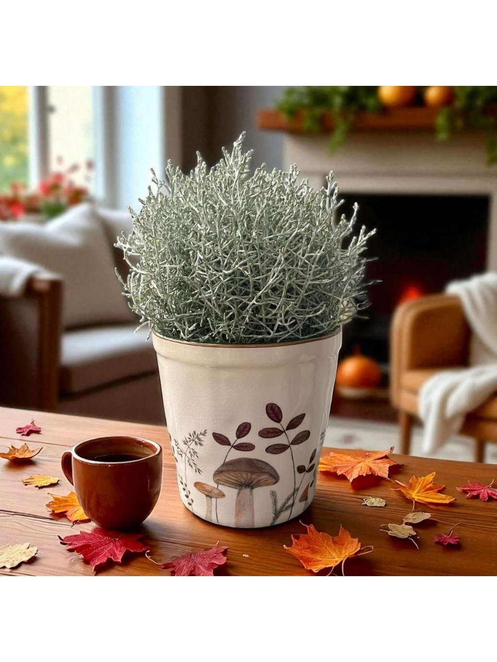 Krásný keramický květináč od značky Clayre & Eef vnese do vašeho interiéru i exteriéru podzimní kouzlo. Jemný přírodní motiv s houbičkami a rostlinami působí rustikálně a nadčasově. Ideální pro pokojové rostliny, bylinky či sezónní květiny. Umístěný na parapetu, zahradním stole nebo jako součást dekorace vytvoří hřejivou a útulnou atmosféru domova.