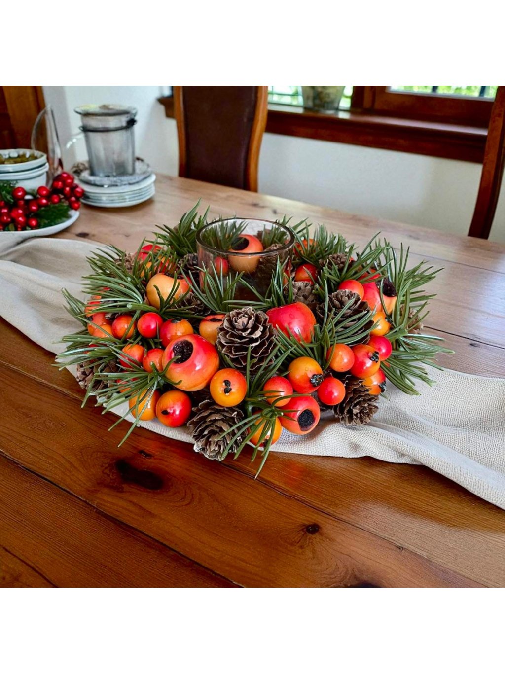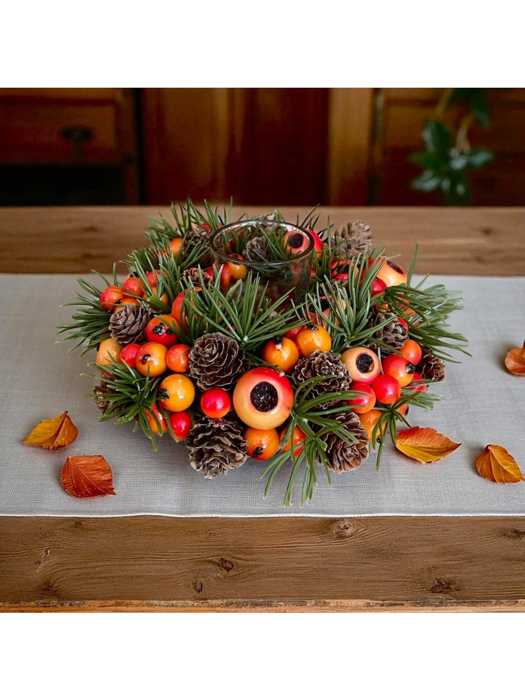 Vychutnejte si kouzlo podzimu v útulné atmosféře domova. Tento krásný svícen zdobený plody, šiškami a zelenými větvičkami vnese na váš stůl či poličku teplé barvy podzimu. Kombinace přírodních tónů a dekorativního provedení vytváří příjemnou, hřejivou náladu, která je ideální pro chladnější večery.