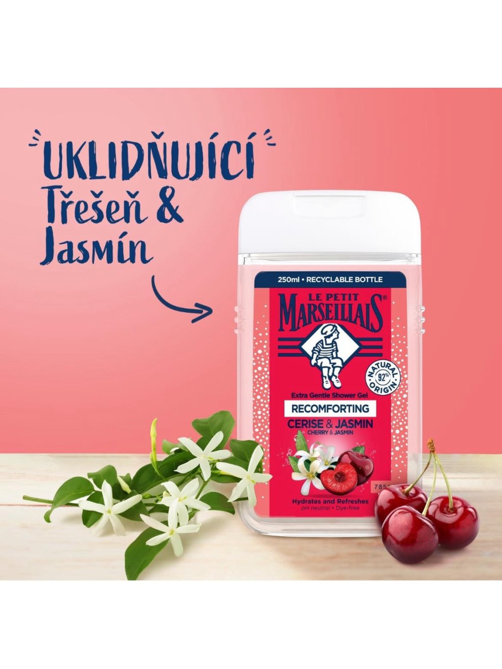 Dermatologicky testováno. Značka Le Petit Marseillais inspirovaná oblastí Provence vytvořila extra jemný sprchový gel se svěží vůní třešeň a jasmín.
