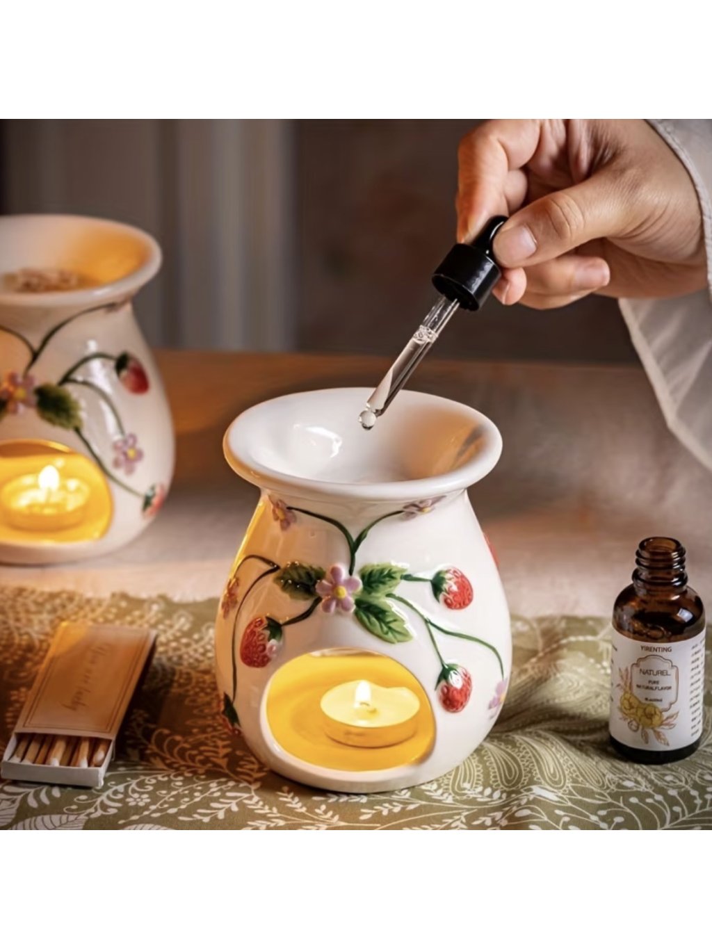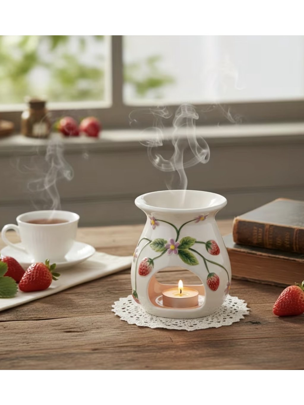 Naše keramická aroma lampička je zdobená roztomilými jahůdkami, které hned zvednou náladu. Stačí přidat pár kapek oblíbeného vonného oleje, zapálit svíčku a užívat si příjemnou vůni, kterou tahle hravá lampička s jahůdkovým motivem rozzáří váš prostor.