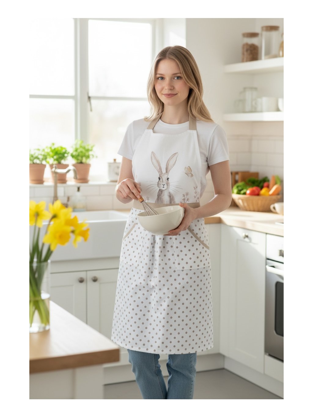 Kvalitní bavlněná zástěra s králíčkem bude vaší pomocnou rukou v kuchyni. Jistě jí oceníte z praktického hlediska a zároveň bude vaším krásným doplňkem