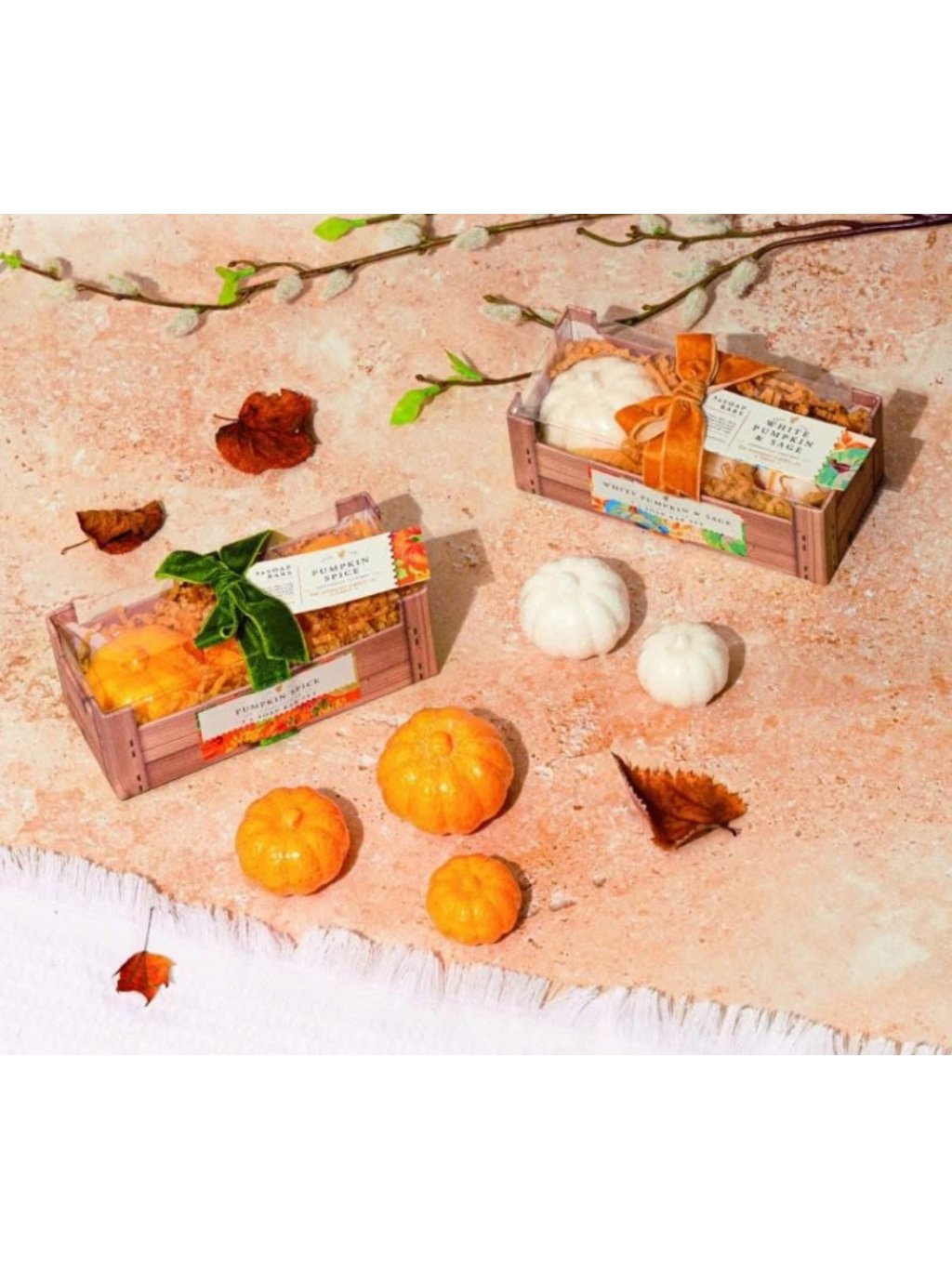 Limitovaná kolekce tuhých mýdel navodí podzimní atmosféru vyváženou vůní svěžích, kořeněných a sladkých tónů dýně a šalvěje, které promění obyčejné mytí rukou ve smyslný zážitek. Pumpkin Spice Soap nabízí 3 velikosti mýdel ve tvaru dýně, kterými můžete dekorat Vaši koupelnu a dopřát si hřejivé objetí podzimních dnů.
