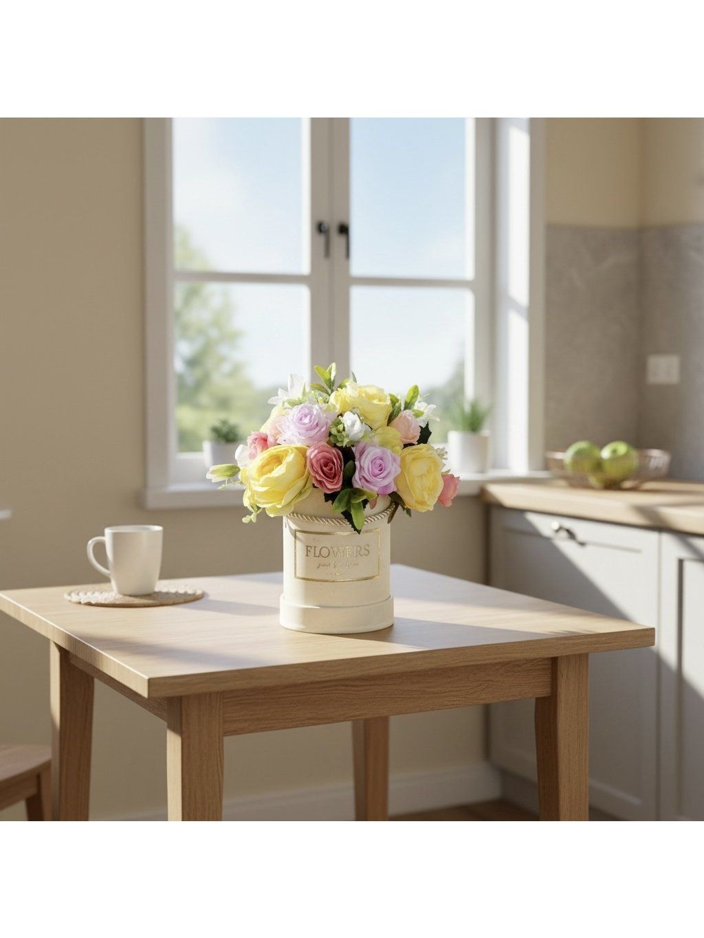Elegantní květinový box v jemných pastelových barvách je krásnou dekorací i milým dárkem pro každou příležitost. Kombinace růžových, žlutých a bílých květů působí romanticky, svěže a velmi vkusně. Dekorace je umístěna v pevném kulatém boxu s nápisem Flowers, který dodává celku luxusní vzhled.