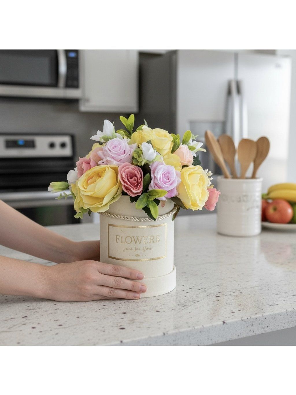 Květinový box se hodí na stůl, komodu, do kuchyně, obývacího pokoje i ložnice. Skvěle vynikne jako jarní dekorace, dárek k narozeninám, svátku, výročí nebo jako milá pozornost pro radost.