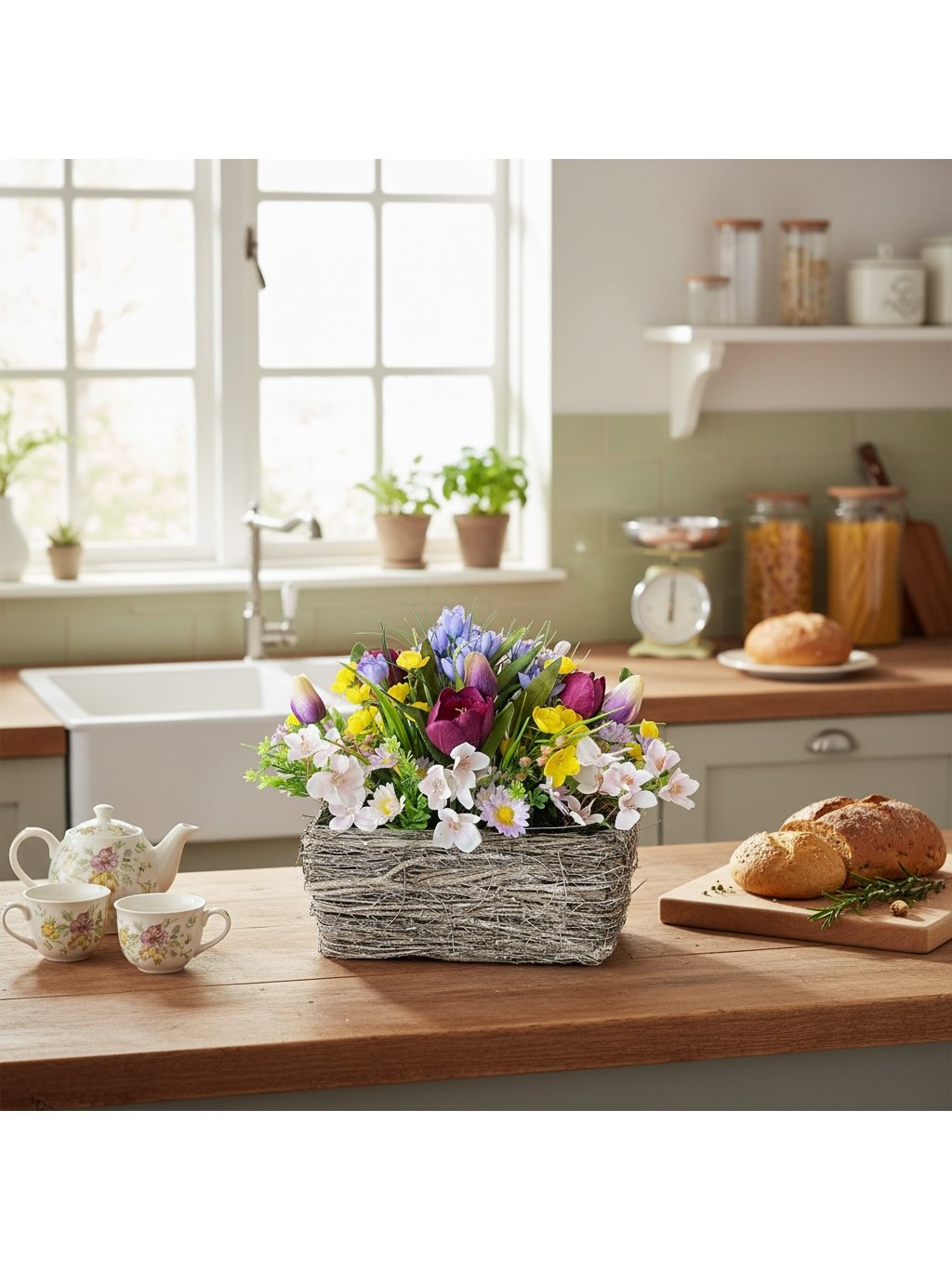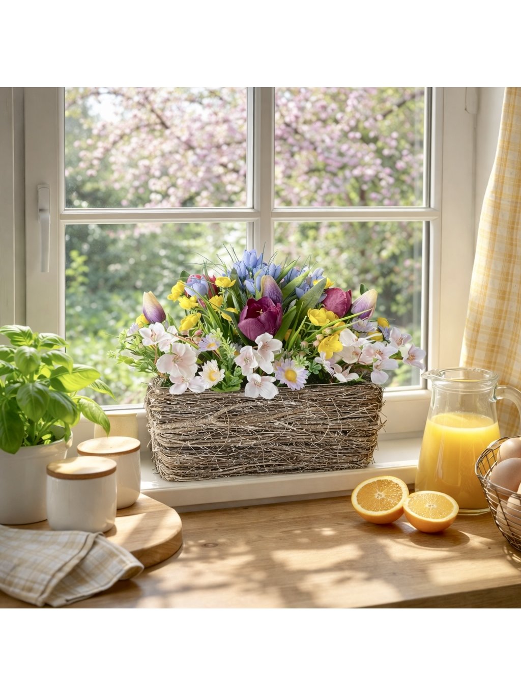Jarní umělé květiny v proutěném truhlíku