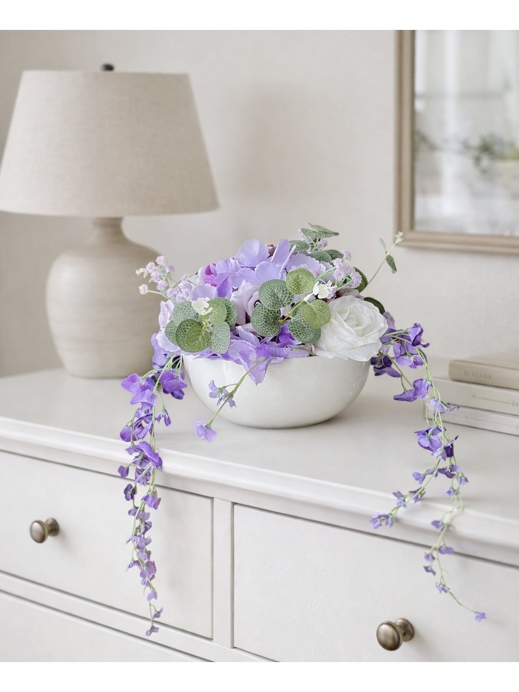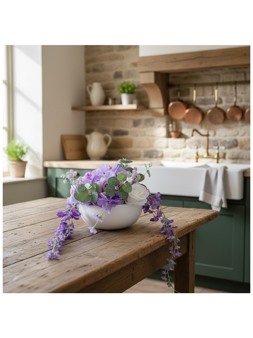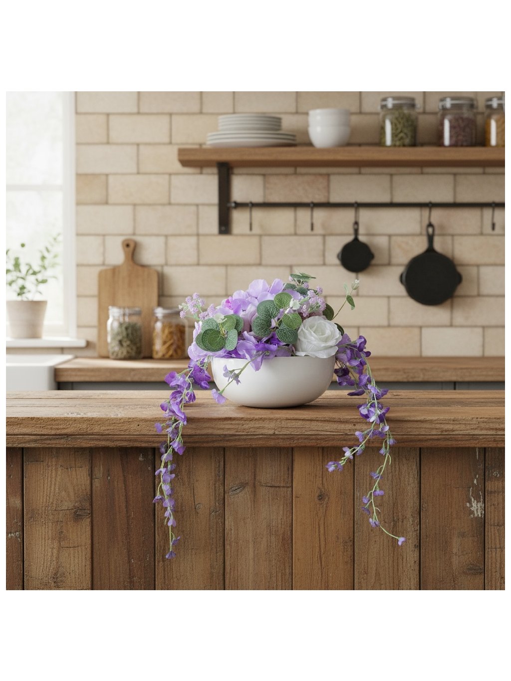 Vneste do svého interiéru jemnou eleganci s naší umělou květinovou dekorací ve fialové barvě, která rozzáří každý prostor. Fialové tóny květů jsou zasazeny do elegantní bílé mísy, která podtrhuje čistý a moderní vzhled. Tyto květiny nepotřebují péči, a přesto působí svěže po celý rok. Ideální volba pro stylovou domácnost nebo jako elegantní dárek.