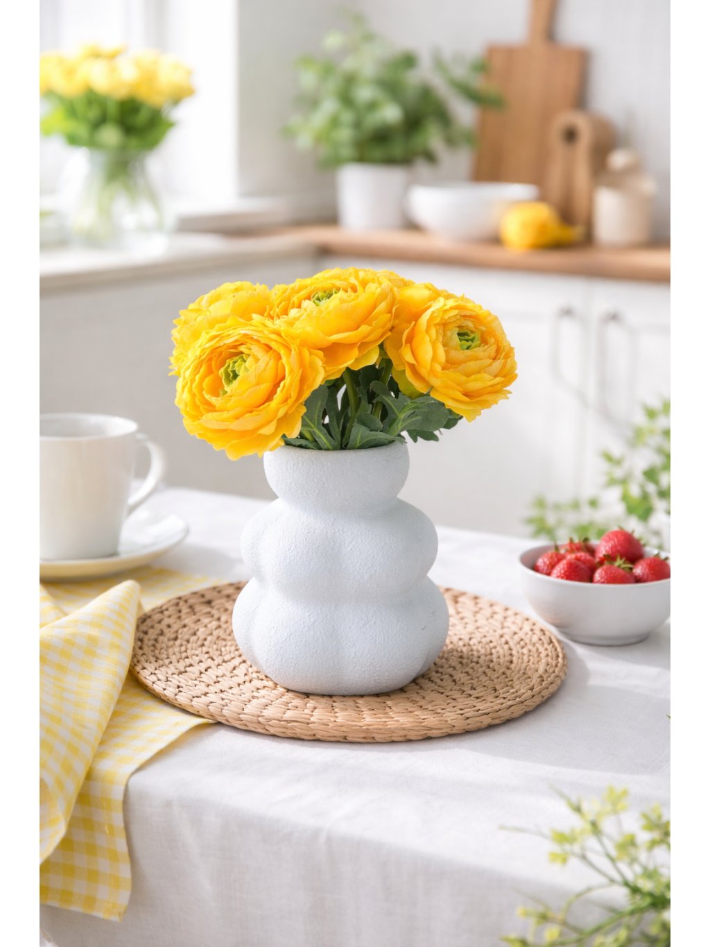 Umělý žlutý pryskyřník s velkým květem je perfektní dekorací, která přinese do interiéru svěží jarní atmosféru.