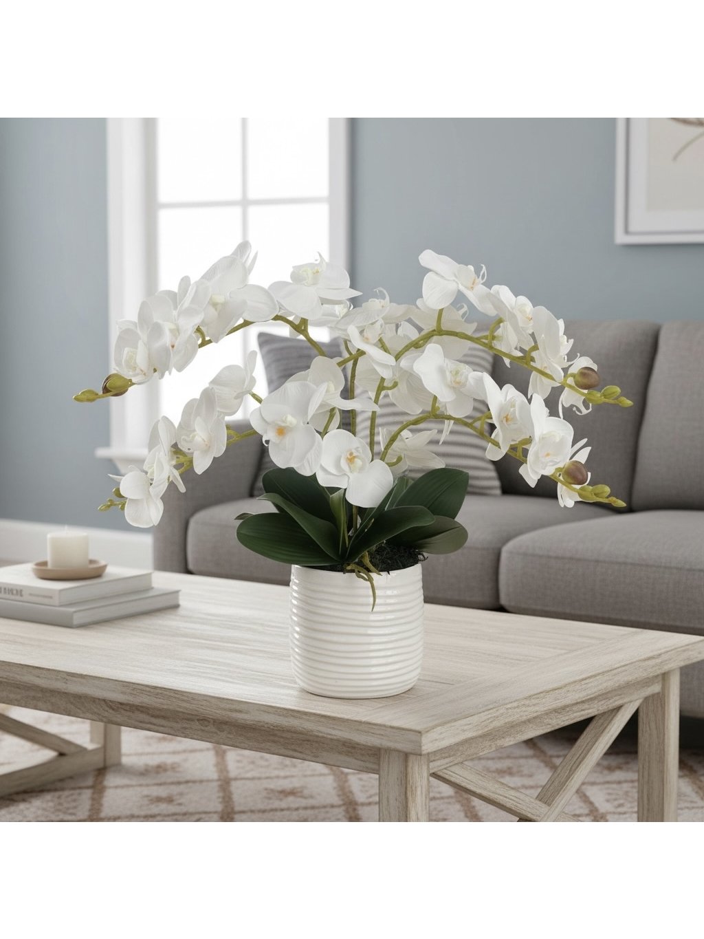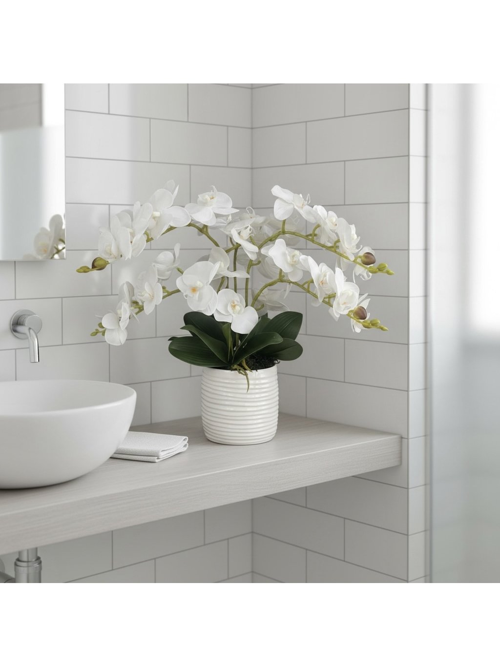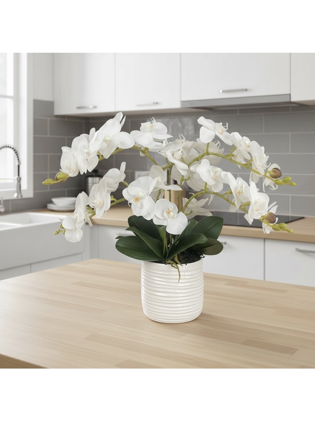 Každý detail je promyšlen tak, aby orchidej vypadala co nejpřirozeněji. Květináč je navržen v neutrálních tónech, které nechávají vyniknout čistotu bílých květů a dodávají celku harmonický vzhled. Tahle orchidej je ideální volbou pro ty, kteří hledají nenáročnou, ale přitom nádhernou dekoraci.