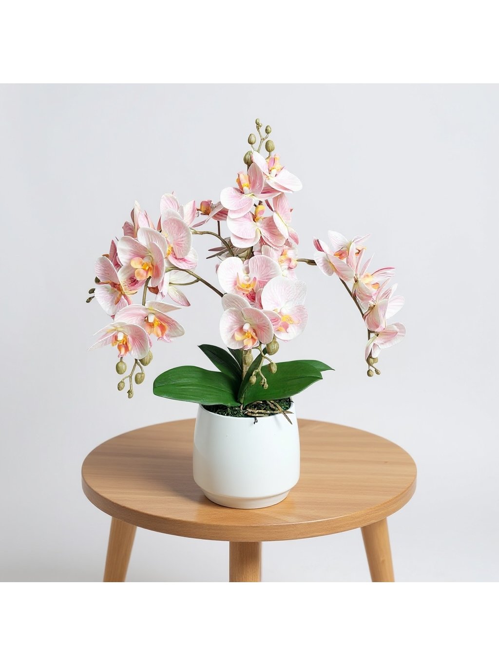 Umělá růžová orchidej v keramickém květináči.