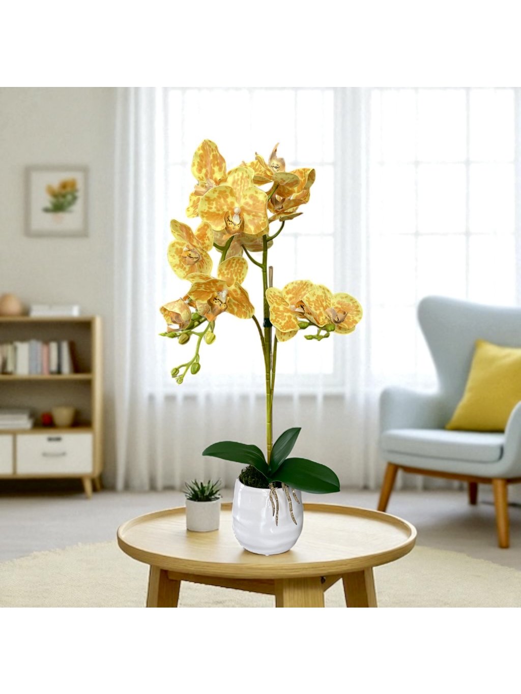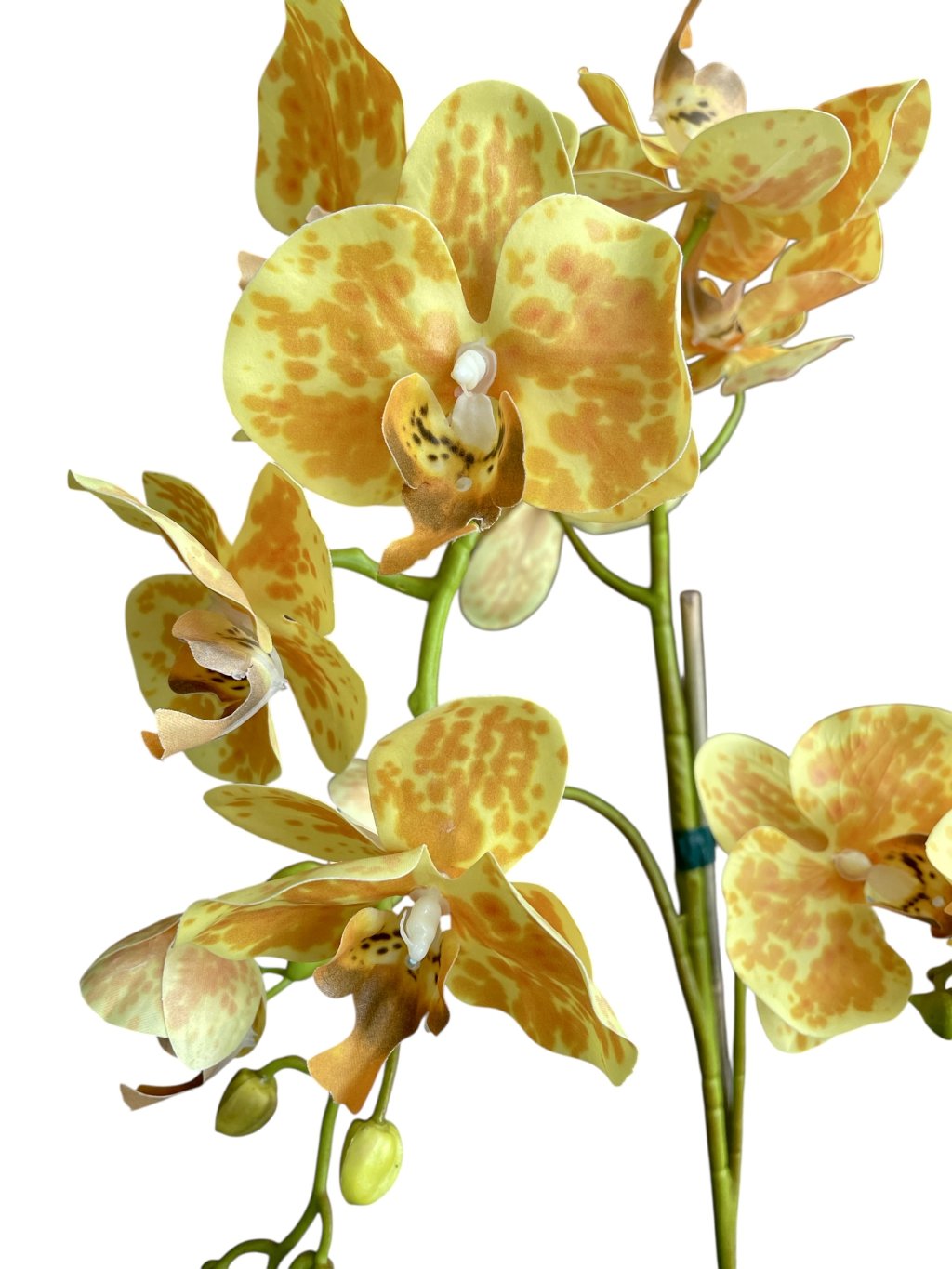 Exotická umělá orchidej o výšce 62 cm je zpracována tak věrohodně, že ji na první pohled nerozeznáte od živé rostliny. Na pevném stonku rozkvétají velké, detailně propracované květy v zářivě žlutém odstínu s jemným vzorem, které působí elegantně a svěže.
