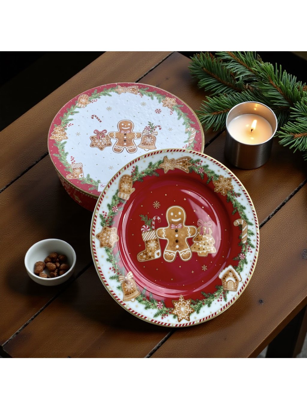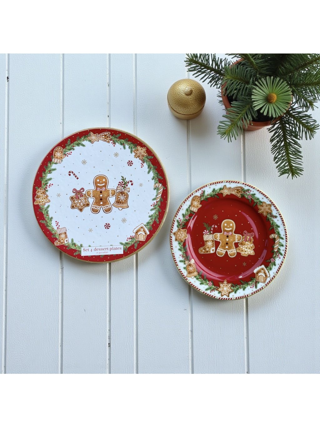 Porcelánové dezertní talíře Fancy Gingerbread jsou baleny po čtyřech kusech v dárkové krabičce.