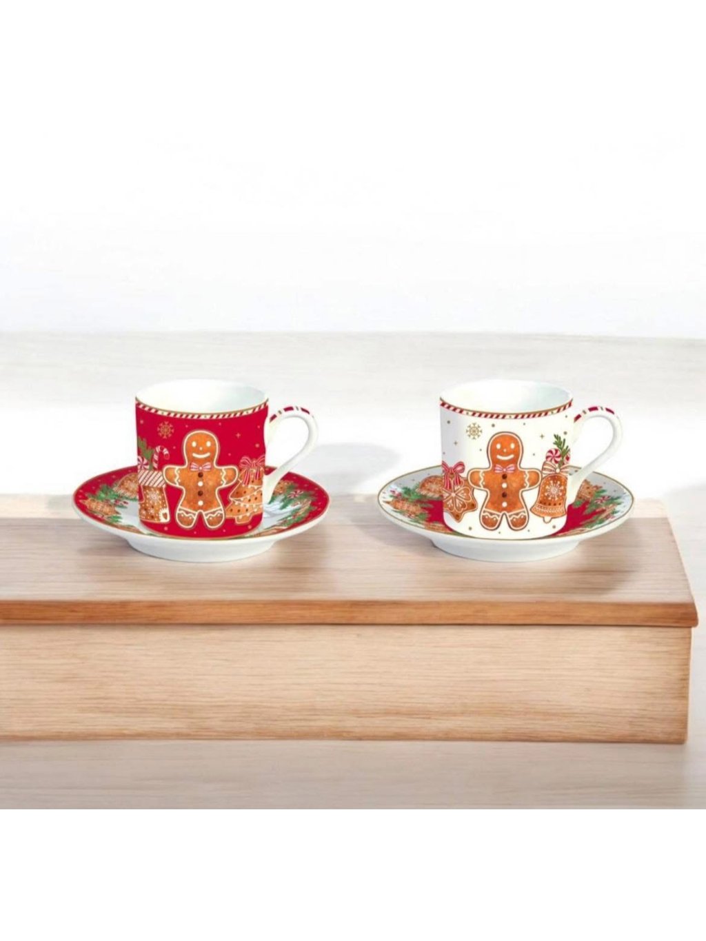 Sada dvou vánočních espresso šálků z kolekce Fancy Gingerbread od italské značky Easy Life, v krásném designu s motivem perníčků, zabalená v dárkové krabičce.