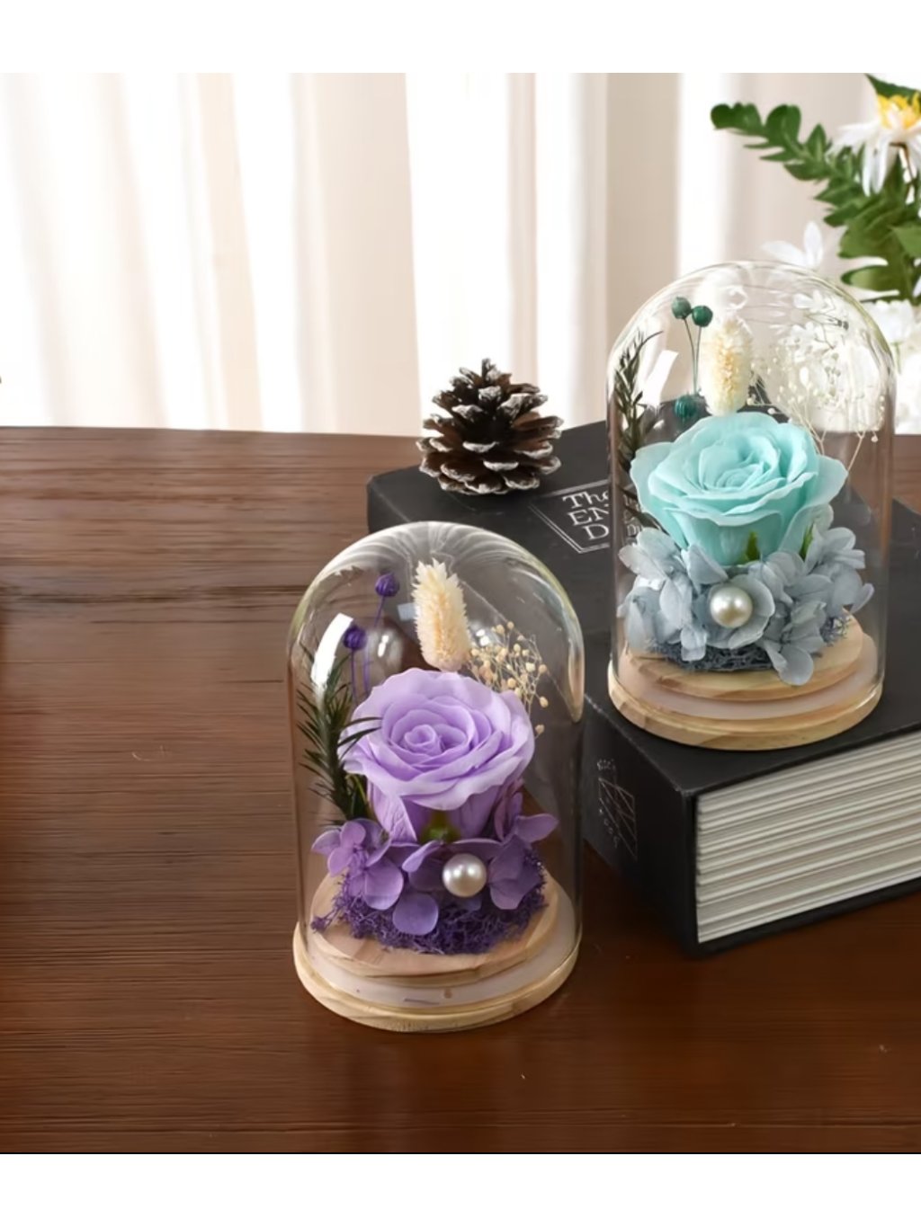Darujte kouzlo, které nikdy nezvadne. Tato elegantní dekorace se skleněným krytem ukrývá nádhernou věčnou růži doplněnou o stabilizované květiny, které si zachovají svou krásu dlouhé roky bez jakékoli péče.