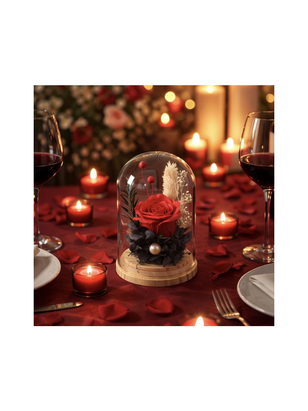 Darujte kouzlo, které nikdy nezvadne. Tato elegantní dekorace se skleněným krytem ukrývá nádhernou růži doplněnou o stabilizované květiny, které si zachovají svou krásu dlouhé roky bez jakékoli péče.