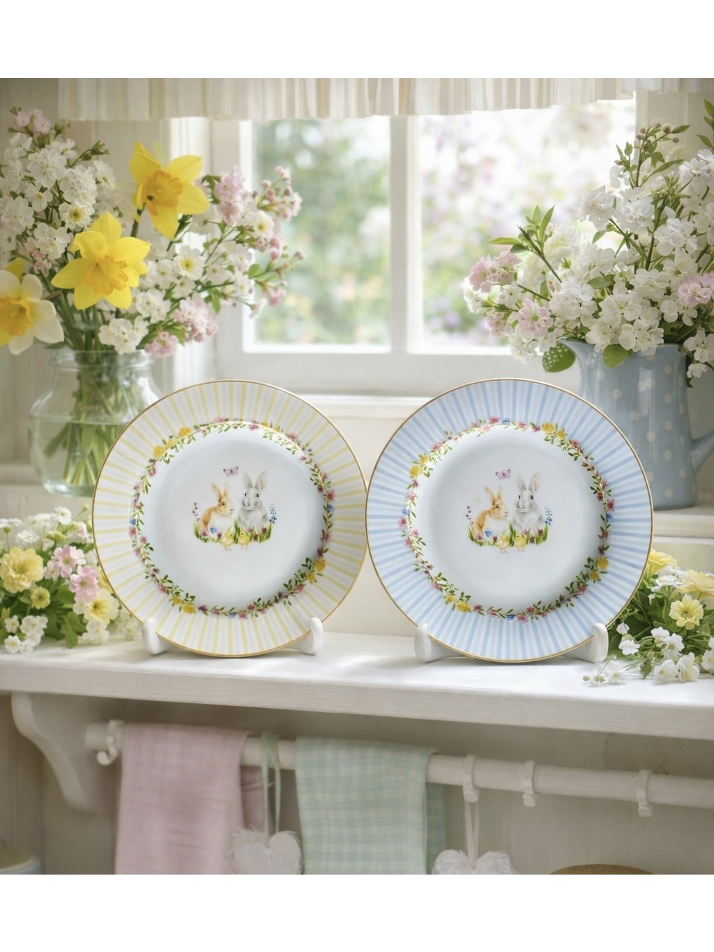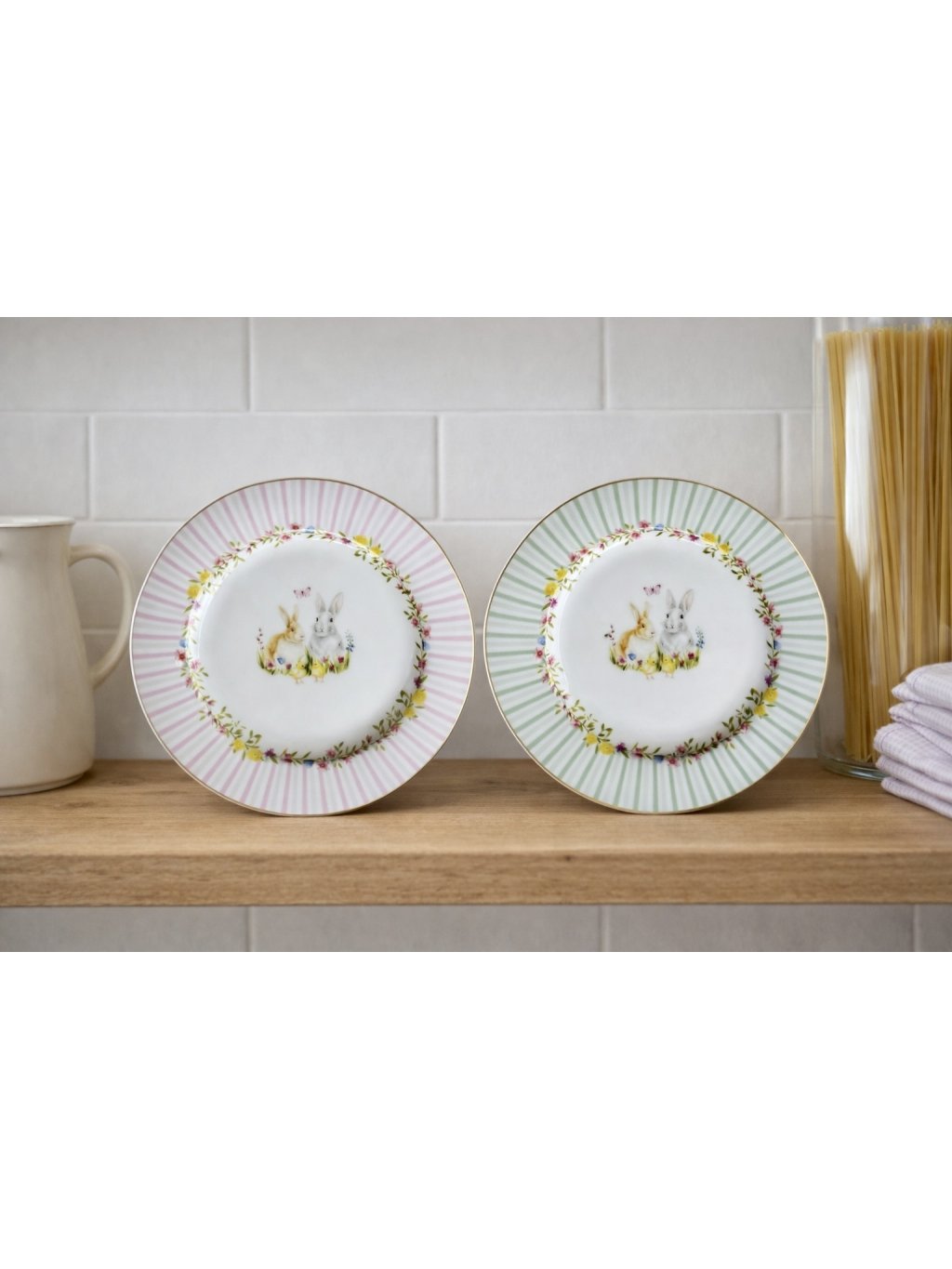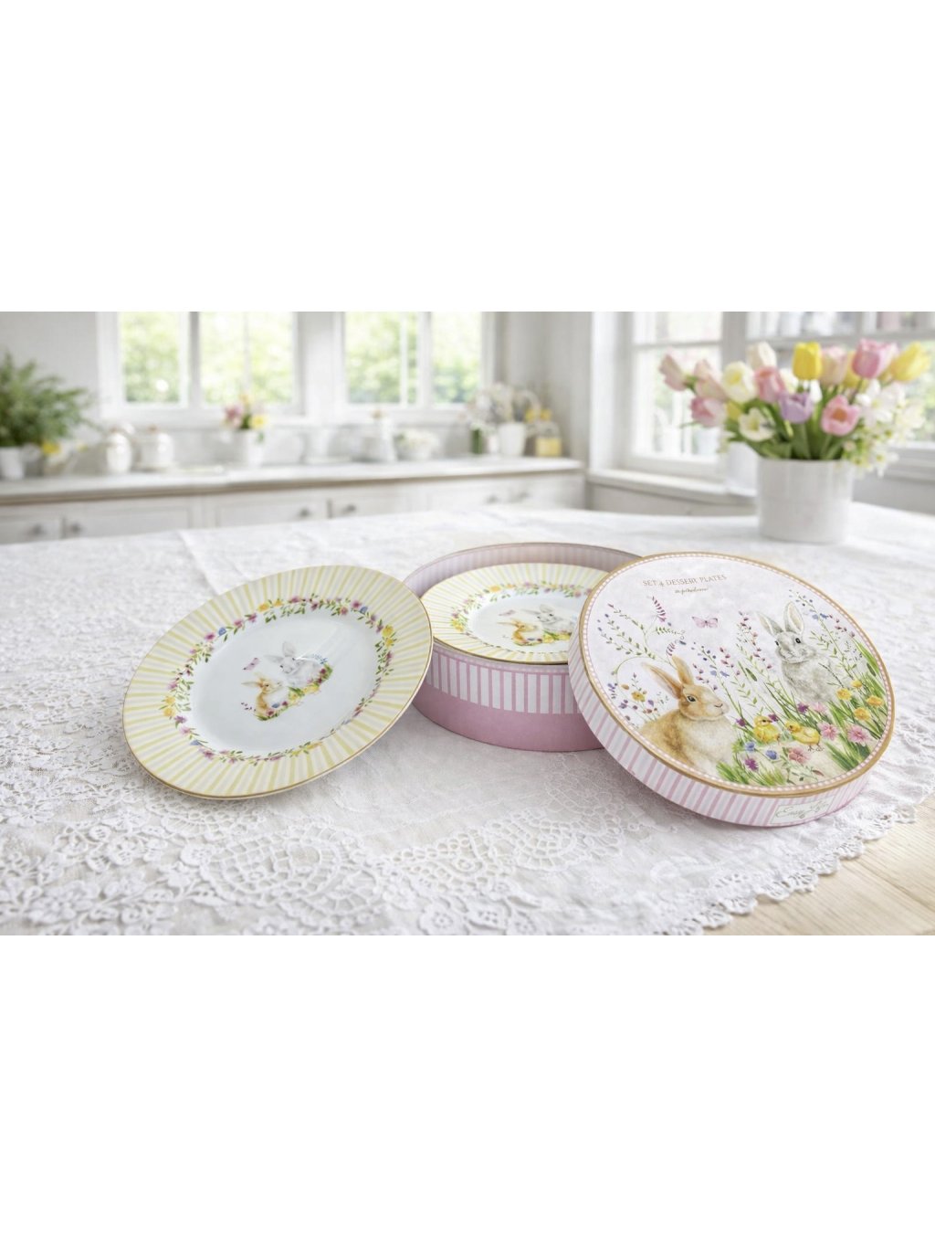 Tato roztomilá sada porcelánových talířků v jemných pastelových barvách je ideální volbou pro jarní a velikonoční stolování. Každý talířek je zdoben hravým motivem zajíčka, který vnese do vašeho domova radostnou a sváteční atmosféru.
